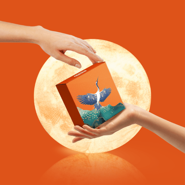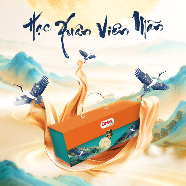 Thiết kế hộp dựa trên tinh thần ấy, kết hợp sắc màu xanh – cam trẻ trung cùng hình ảnh hạc xuân mạnh mẽ vươn mình, gửi gắm lời chúc may mắn – an khang – thịnh vượng cho năm mới. Hiệu ứng phối cảnh trăng sáng, núi non và bầu trời xuân tạo nên một tổng thể sang trọng, tinh tế và đầy chất nghệ thuật.